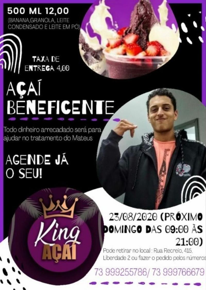 No próximo domingo, 23 de agosto, toda a arrecadação nas vendas de açaí do King Açaí será destinada para o tratamento de Mateus. O valor proposto é de R$ 12 para 500ml de açaí tradicional (granola, leite condensado, banana e leite em pó).