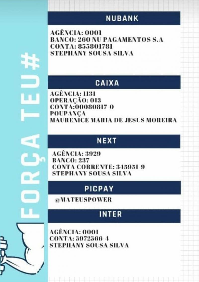 Quem quiser ajudar no tratamento do Mateus de Jesus, confira na imagem abaixo os dados bancários para depósito ou transferência.