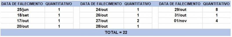 O boletim epidemiológico de hoje contabiliza 22 óbitos que ocorreram em diversas datas, conforme tabela abaixo. A existência de registros tardios e/ou acúmulo de casos deve-se a sobrecarga das equipes de investigação, pois há doenças de notificação compulsória para além da Covid-19. Outro motivo é o aprofundamento das investigações epidemiológicas por parte das vigilâncias municipais e estadual a fim de evitar distorções ou equívocos, como desconsiderar a causa do óbito um traumatismo craniano ou um câncer em estágio terminal, ainda que a pessoa esteja infectada pelo coronavírus.