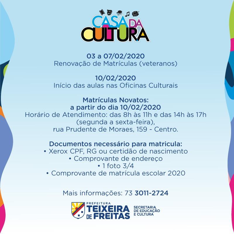 E para cumprir esta meta a Prefeitura Municipal de Teixeira de Freitas (PMTF), através do Departamento de Cultura, abre, no próximo dia 3 de fevereiro, segunda-feira, a renovação de matrícula, que vai até o dia 7, das oficinas culturais promovidas pela Casa da Cultura. Após o dia 7 da renovação, no dia 10 acontece a matrícula para novos alunos.