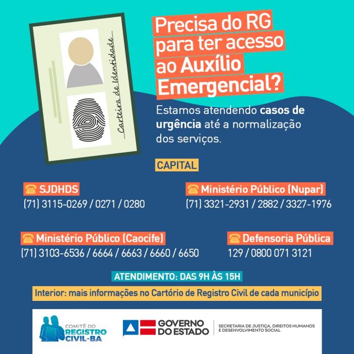 Com o objetivo de viabilizar a emissão de documentos de identidade e certidões de nascimento/casamento para pessoas em situação de vulnerabilidade social que têm direito ao benefício emergencial do governo federal, o Comitê Gestor Estadual do Plano Social Registro Civil de Nascimento e Acesso à Documentação Civil Básica realizará atendimento para a população em caráter emergencial.