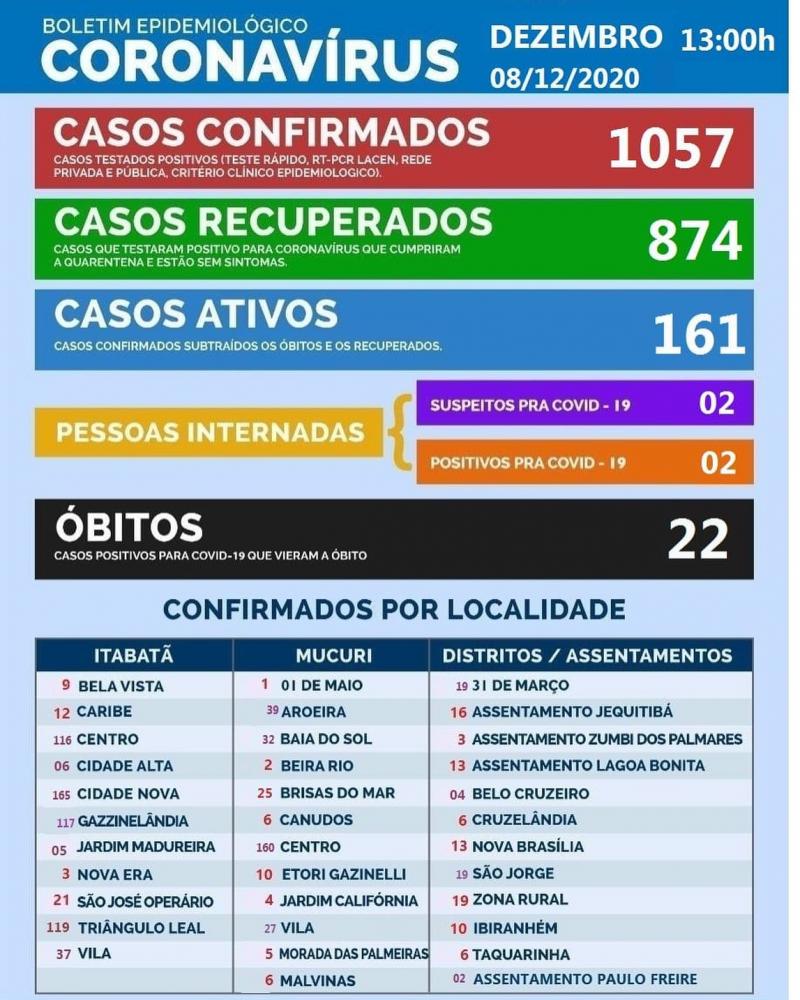 A Secretaria Municipal da Saúde de Mucuri informou às 13h, desta terça-feira, 8 de dezembro, através de boletim epidemiológico oficial, que o número de contaminados pelo novo coronavírus (covid-19) aumentou no município. O total agora são de 1057 casos e 22 mortes.