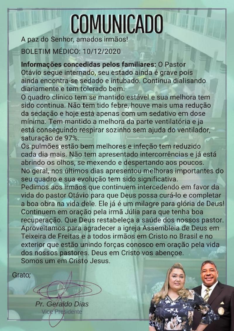 O vice-presidente das Assembleias de Deus, pastor Geraldo Dias, fez um comunicado a todos os fiéis, amigos, imprensa e demais interessados, falando sobre a evolução no quadro de saúde do pastor Otávio Rendeiro, acometido com covid-19.