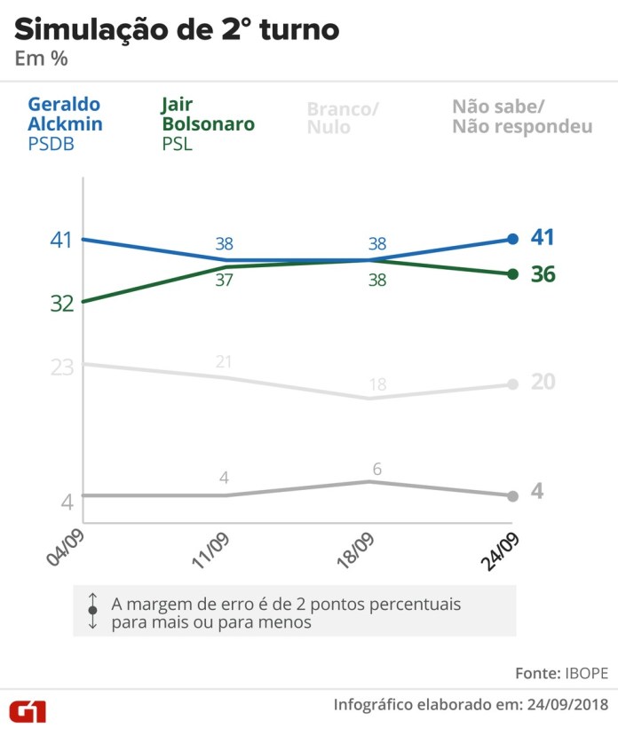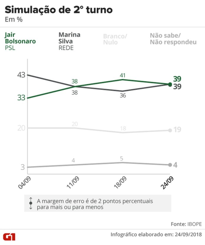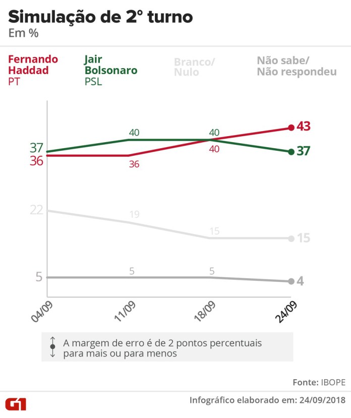Os indecisos foram de 7% para 6% e os brancos ou nulos, de 14% para 12%.