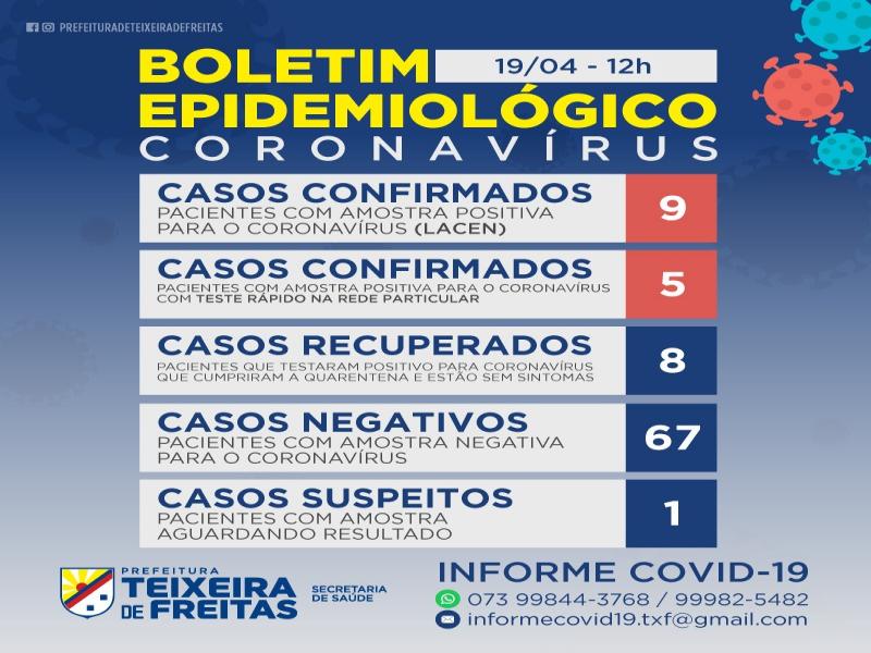 A Secretaria Municipal de Saúde de Teixeira de Freitas informa, neste domingo (19), o registro de um novo caso positivo e um novo negativo. Neste momento, temos, portanto, apenas um paciente aguardando resultado do exame do LACEN-BA. A pessoa com caso confirmado hoje, está em isolamento hospitalar. Em nome da prevenção, a Secretaria Municipal de Saúde recomenda: fique em casa.