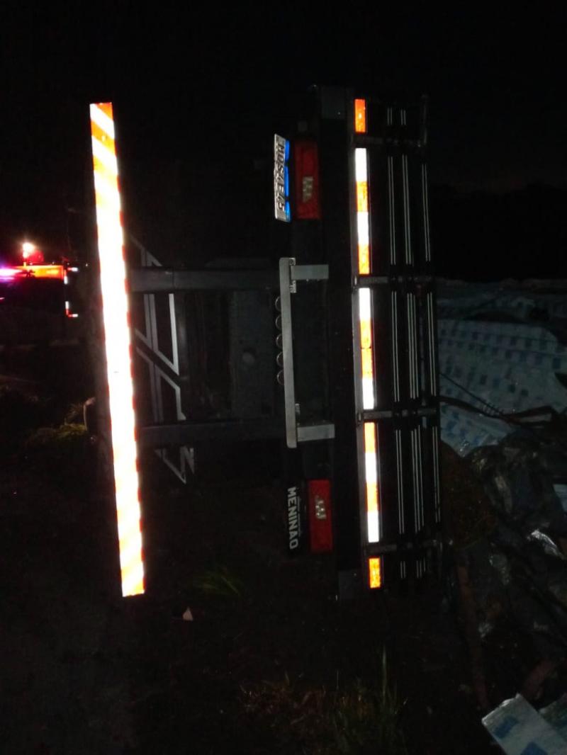 O motorista da carreta identificado como Magno Moraes, de 38 anos, contou que conduzia a carreta de placa MQS-4E45, carregado de viga, e ao fazer uma curva próximo ao Posto Malacarne a carga puxou para o lado direito e a carreta tombou.