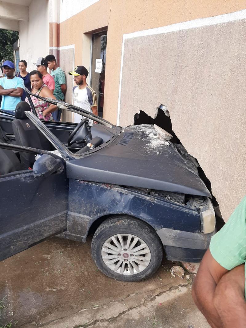 Um motorista conduzindo um Fiat Uno, passou por debaixo de três carretas que transportam eucaliptos que estavam paradas, arrancou o teto do veículo e colidiu de frente com a parede do SAMU.