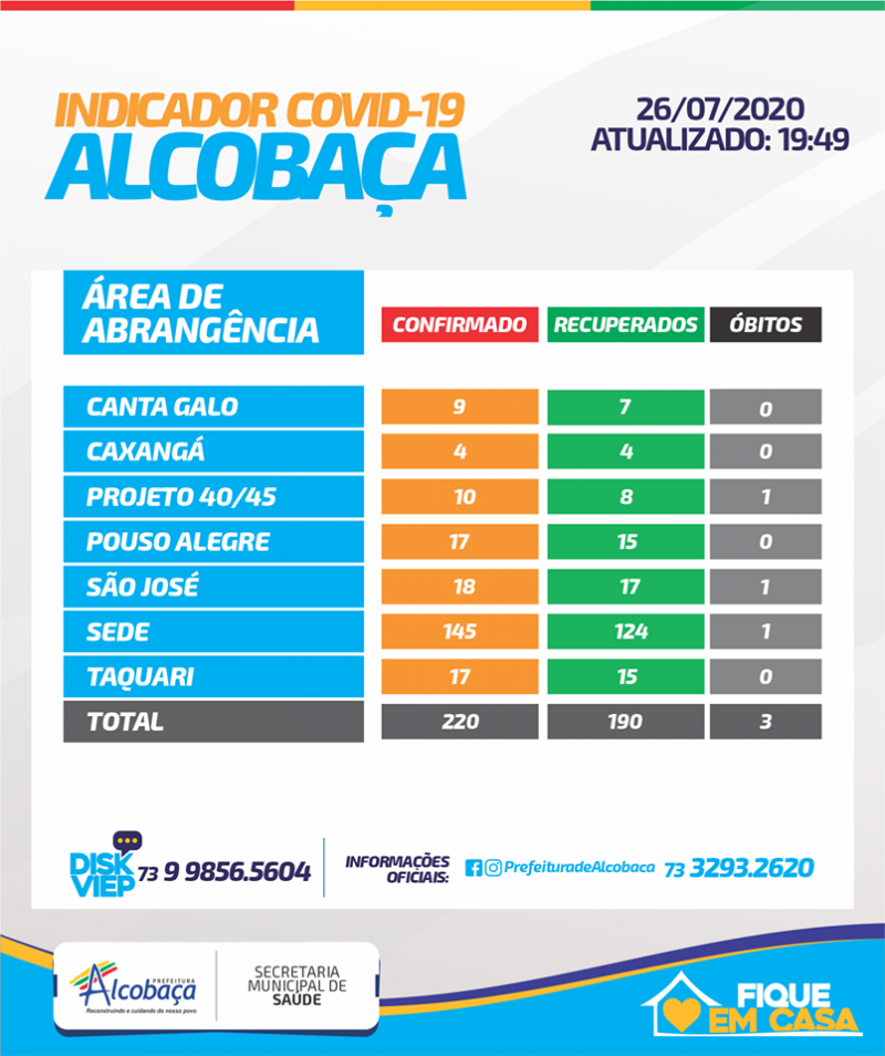 A Secretaria Municipal da Saúde de Alcobaça informou às 19h49, deste domingo, 26 de julho, através de boletim epidemiológico oficial, que o número de contaminados pelo novo coronavírus (covid-19) aumentou no município. O total agora são de 220 casos.