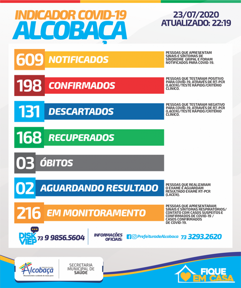 A Secretaria Municipal da Saúde de Alcobaça informou às 22h19, desta quinta-feira, 23 de julho, através de boletim epidemiológico oficial, que o número de contaminados pelo novo coronavírus (covid-19) aumentou no município. O total agora são de 198 casos.