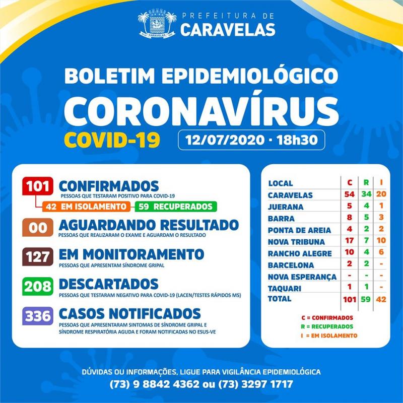 A Prefeitura Municipal de Caravelas, através da Secretaria Municipal de Saúde, confirmou às 18h30 deste domingo, 12 de julho, por meio do boletim epidemiológico, 7 novos casos positivos para covid-19.