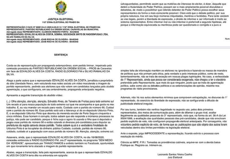 Em sua decisão, o Juiz de Direito, Dr. Leonardo Coelho Vieira, arguiu que a partir de uma análise detida, à luz do princípio da livre manifestação do pensamento, as ásperas críticas proferidas pelo 1° representado são próprias do debate político, próprias de um Estado Democrático de Direito, de modo a não configurar publicidade eleitoral ilícita, e pontuou trechos retirados do parecer do Ministério Público. E decidiu: […] “Ademais, não há nos autos elementos mínimos que comprovem extrapolação, no discurso do 1° representado (Edvaldo Alves), do exercício da liberdade de expressão, não se configurando a difusão de publicidade eleitoral irregular”.