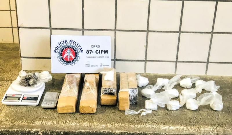 Ao adentrar na casa foi localizado o Bruno e 02 balanças de precisão, 04 tabletes de maconha pesando 4,060 kg e 14 papelotes de cocaína pesando 605 gramas. O material e os indivíduos foram conduzidos a DP.