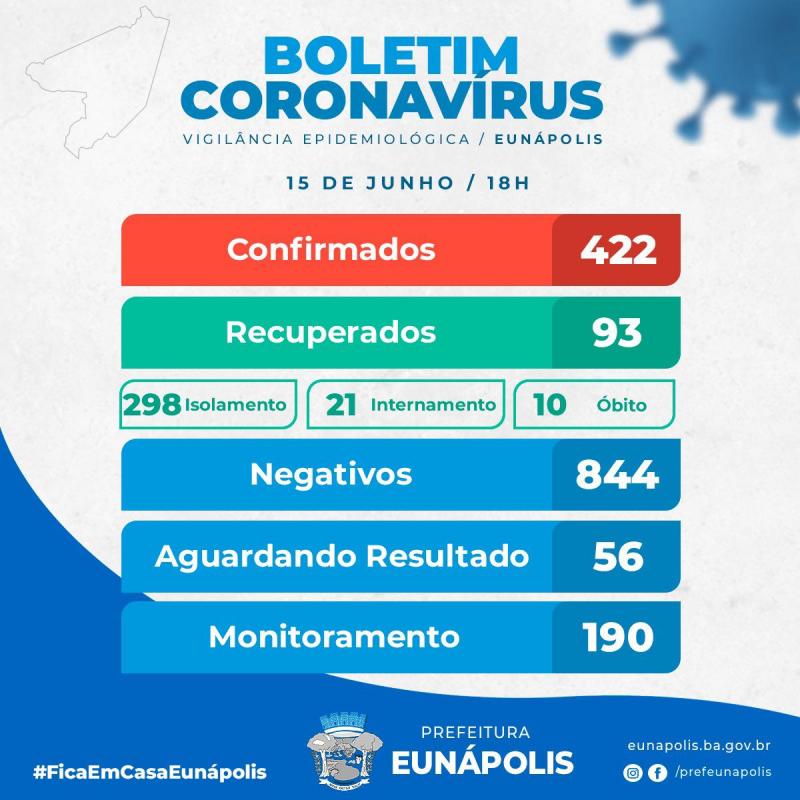 A Secretaria Municipal de Saúde de Eunápolis confirmou às 18h desta segunda-feira, 15 de junho, que o município tem agora 422 pacientes confirmados para a covid-19, sendo: