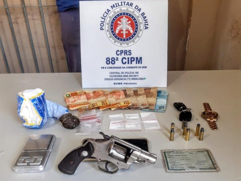Por volta das 11 horas da manhã da segunda-feira, 21 de setembro, policiais do Pelotão de Emprego Tático Operacional (PETO), flagraram dentro da caixa de fusível embaixo do volante do veículo Gol G3, cor prata, placa policial HDD 5B18, Jeison Santos Silva, vulgo “G”, com um revólver Taurus, calibre 32, municiado com 05 cartuchos intactos e sete poções de cocaína.