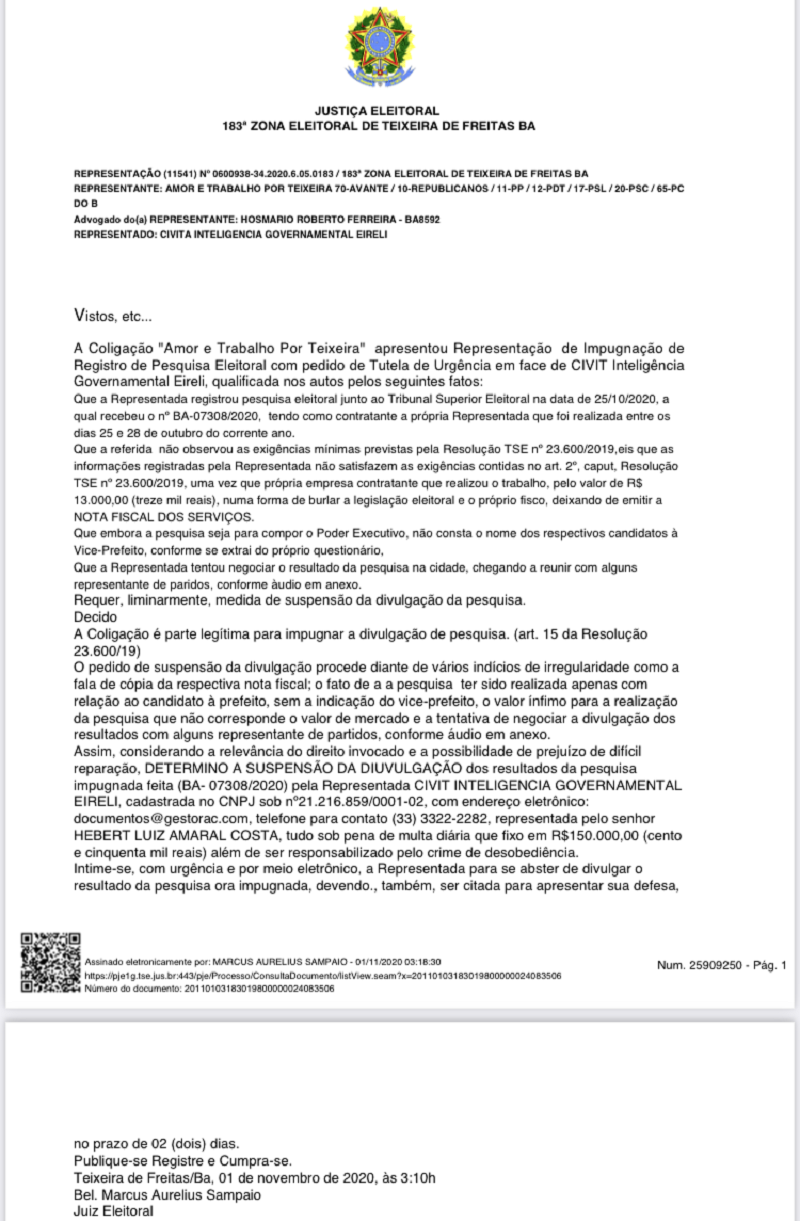 Teixeira de Freitas: O Juiz, Dr. Marcus Aurelius Sampaio, da 183ª Zona Eleitoral de Teixeira de Freitas, determinou neste domingo, 01 de novembro, a Suspensão da Divulgação de uma Pesquisa Eleitoral, realizada pela empresa CIVIT Inteligência Governamental Eireli, cuja pesquisa foi registrada no TSE, sob o número BA-07308/2020. O pedido foi feito pela Coligação “Amor e Trabalho Por Teixeira”, que apresentou Representação de Impugnação de Registro de Pesquisa Eleitoral com pedido de Tutela de Urgência em face da referida empresa.