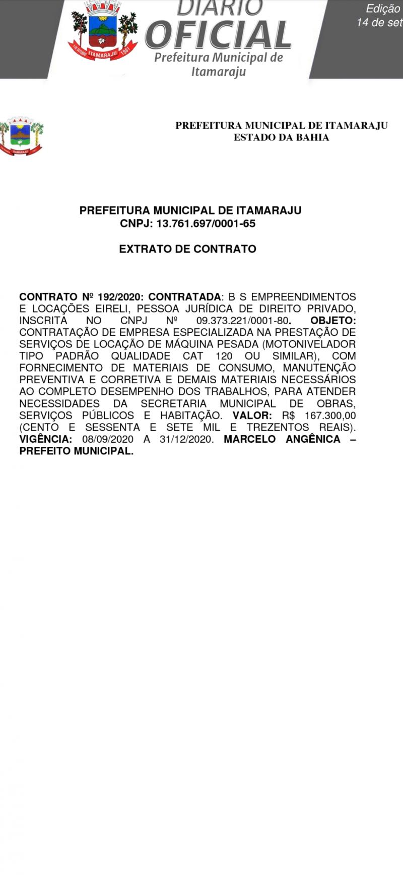 A prefeitura de Itamaraju publicou no último dia 14 de setembro o contrato com a empresa BS Empreendimentos visando a locação de uma motoniveladora (patrol) pelo valor de R$ 167 mil. O contrato tem validade até 31 de dezembro de 2020.