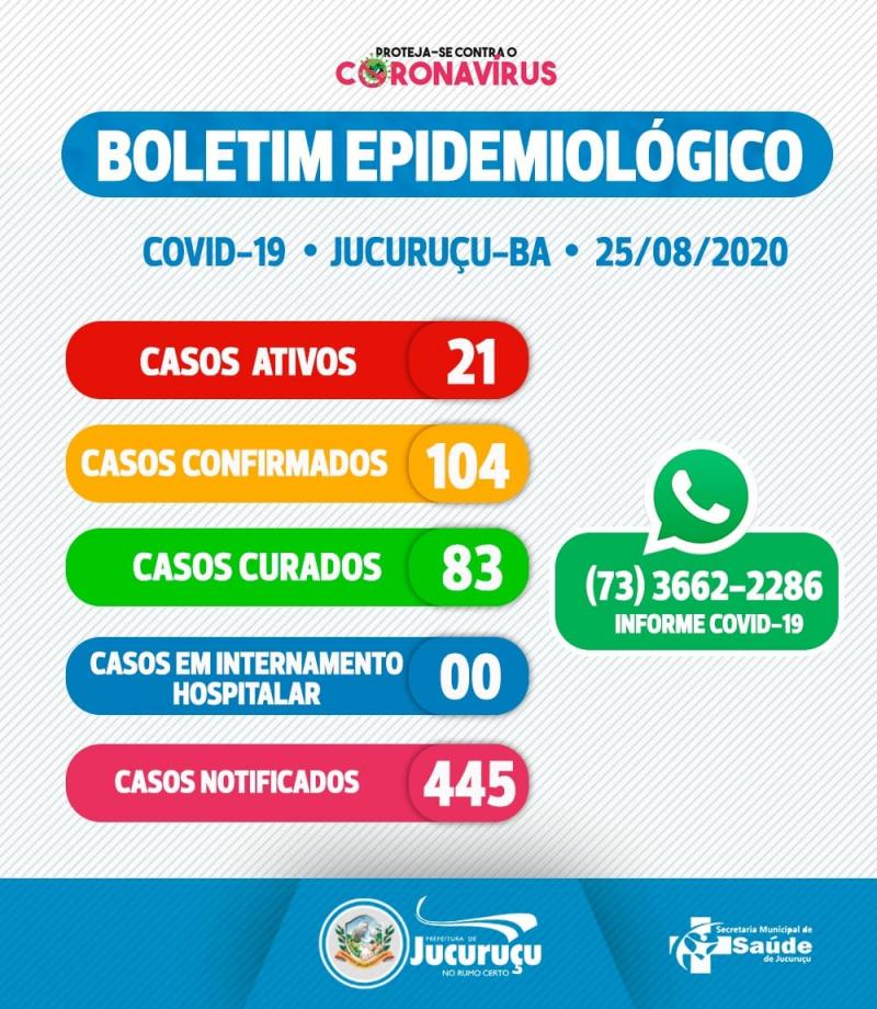 A Prefeitura de Jucuruçu através da Secretaria de saúde, vem por meio deste, informar que nossa equipe de vigilância identificou, através do centro de testagem e atendimento ambulatorial do COVID, mais 11 casos totalizando 104 casos confirmados. Desta forma passamos da marca de 100 casos confirmados desde o início da pandemia.