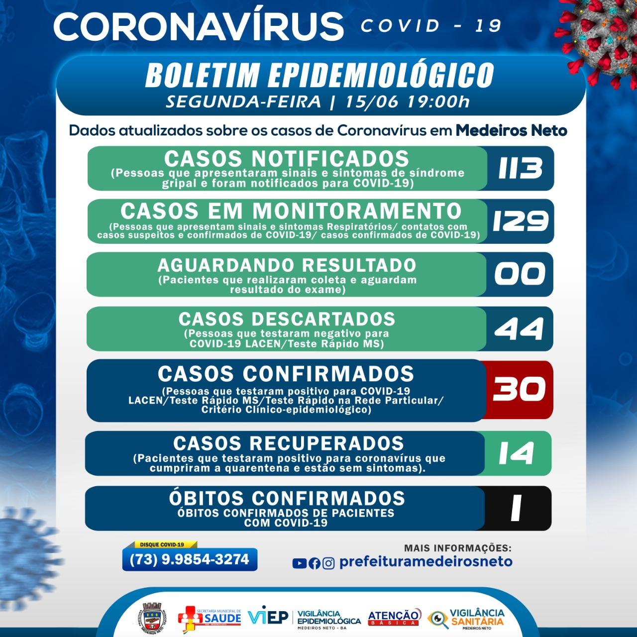 Medeiros Neto registrou nesta segunda-feira, 15 de junho, 15 novos casos de covid-19 no município. A informação consta no boletim epidemiológico e indica que o total acumulado chega a 30 casos confirmados.