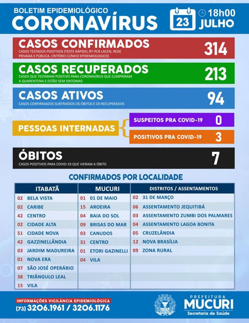 A Secretaria Municipal da Saúde de Mucuri informou às 18h, desta quinta-feira, 23 de julho, através de boletim epidemiológico oficial, que o número de contaminados pelo novo coronavírus (covid-19) aumentou no município. O total agora são de 314 casos e 7 mortes.