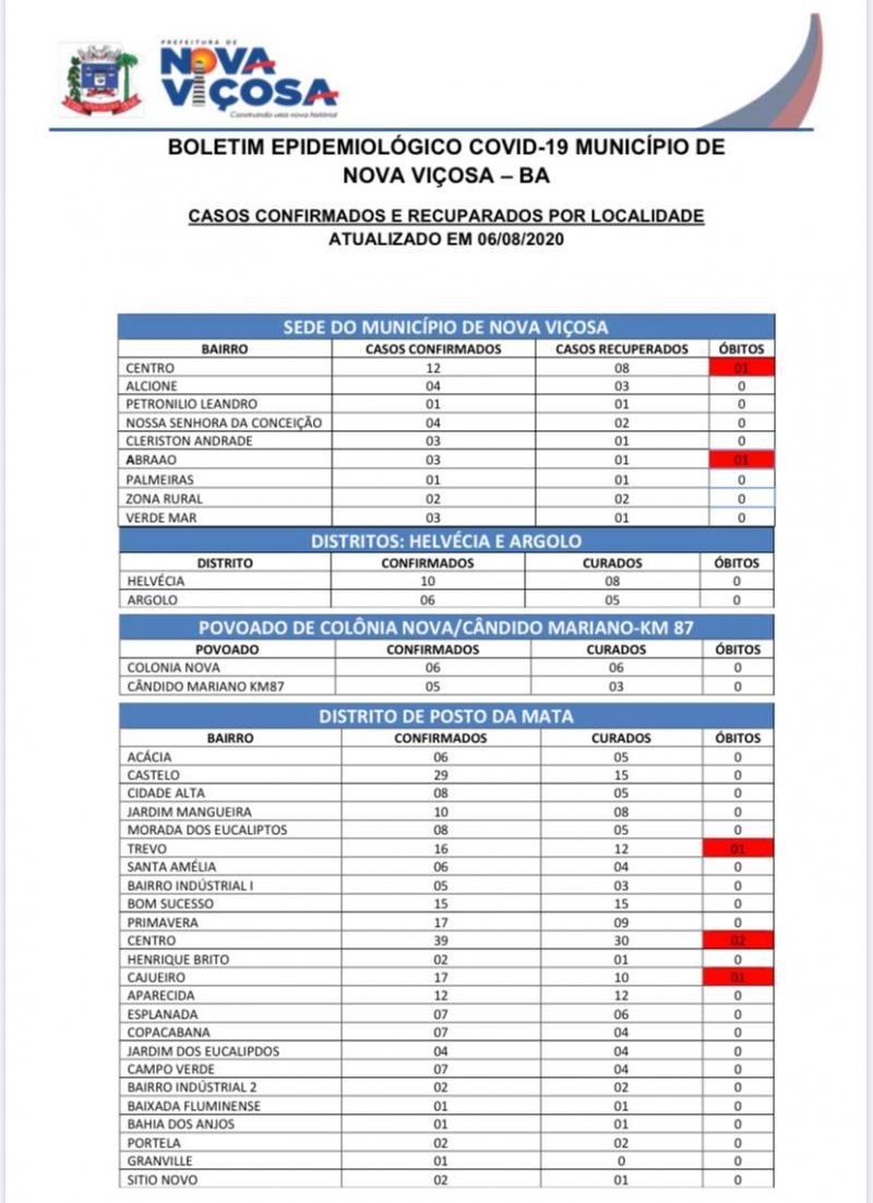 A Prefeitura Municipal de Nova Viçosa através da Secretaria Municipal de Saúde divulgou às 16h desta quinta-feira, 6 de agosto, mais um boletim epidemiológico, confirmando que o município agora tem 282 casos da doença.
