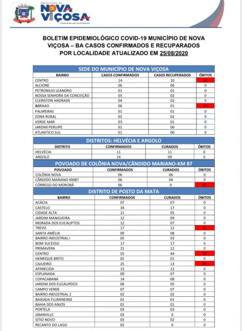 A prefeitura de Nova Viçosa através da secretaria de saúde divulgou às 16 horas desta terça-feira, 25 de agosto, mais um Boletim Epidemiológico, confirmando que o município agora tem 374 casos da doença.
