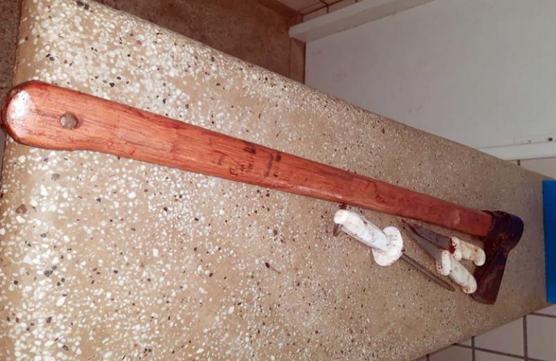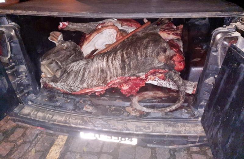 Ao fazer uma busca pessoal dentro do veículo os militares encontraram uma vaca abatida e dividida em quatro partes, além de um machado, uma chará, duas facas usada para no abate do animal e cinco grama de cocaína.