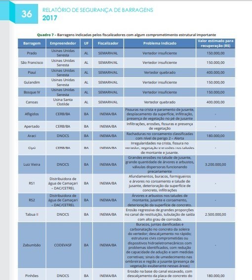 De acordo com o último Relatório de Segurança de Barragens publicado em 2017 pela ANA, somente na Bahia, existem dez barragens apontadas pelos fiscalizadores com algum comprometimento estrutural importante. Entre os problemas identificados estão infiltrações, erosões, rachaduras, deterioração do concreto, buracos e estruturas comprometidas.