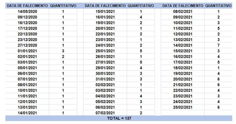 Nesta sexta-feira (26) foram registrados 137 óbitos, o maior número desde o início da pandemia em um boletim epidemiológico sobre a Covid-19. Apesar dos óbitos terem ocorrido em diversas datas, a confirmação e registro foram contabilizados hoje. Esse número supera o ocorrido ontem (25), quando foram contabilizados 100 óbitos. O número de hoje demonstra o crescimento de casos graves, o que tem ampliado a taxa de ocupação nas UTIs.