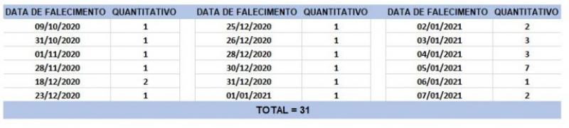 O boletim epidemiológico de hoje contabiliza 31 óbitos que ocorreram em diversas datas, conforme tabela abaixo.