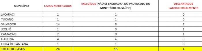 De janeiro até às 17h desta sexta-feira, 28 de fevereiro, a Bahia registrou 24 casos notificados com suspeita clínica de infecção pelo novo coronavírus, sendo 15 excluídos por não se enquadrarem no protocolo do Ministério da Saúde (MS), 4 foram descartados laboratorialmente e 5 aguardam análise laboratorial. Os municípios notificantes foram Camaçari (2), Jequié (1), Tucano (1), Itabuna (4), Jacaraci (1), Salvador (14) e Feira de Santana (1). Estes números representam notificações oficiais compiladas pelo Centro de Informações Estratégicas em Vigilância em Saúde da Bahia (Cievs-BA) em conjunto com os Cievs municipais.