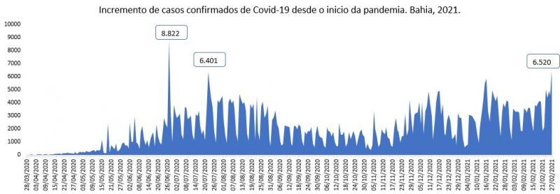 Na Bahia, nas últimas 24 horas, foram registrados 6.520 casos de Covid-19 (taxa de crescimento de +1,0%) e 5.672 recuperados (+0,9%). Este foi o maior incremento de novos casos em 2021 e segundo maior da pandemia. Dos 680.904 casos confirmados desde o início da pandemia, 648.593 já são considerados recuperados e 20.582 encontram-se ativos.