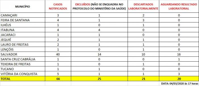 De janeiro até às 17 horas desta quarta-feira, 4 de março, a Bahia registrou 66 casos notificados com suspeita clínica de infecção pelo novo coronavírus, sendo 25 excluídos por não se enquadrarem no protocolo do Ministério da Saúde (MS), 21 foram descartados laboratorialmente e 20 aguardam análise laboratorial. Os municípios notificantes foram: