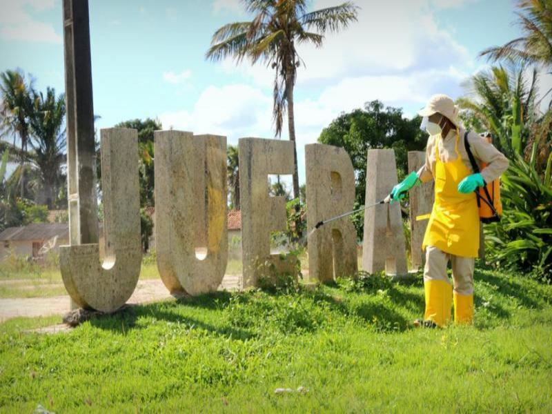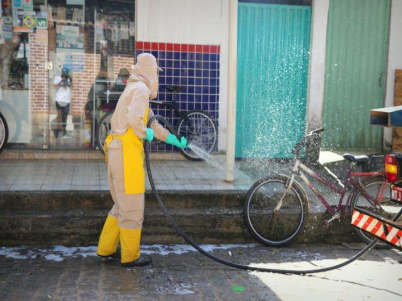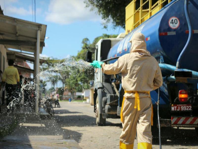 A proteção coletiva contou com a higienização de espaços públicos, utilizando carro pipa e servidores municipais (equipados de bombas costais) na aplicação de substância desinfetante, recomendada pela Anvisa, para impedir a proliferação da covid-19 em superfícies, onde o contato poderia colocar a população em riscos de contágio.