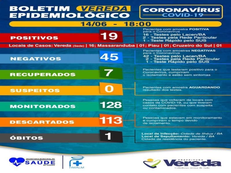 A Secretaria Municipal de Saúde de Vereda informa através do Boletim Epidemiológico atualizado hoje dia 14/06 (Domingo) às 18:00h que dos 05 casos SUSPEITOS que estavam aguardando resultado, obtivemos o resultado de 02 testes Positivos e 03 Negativos.
