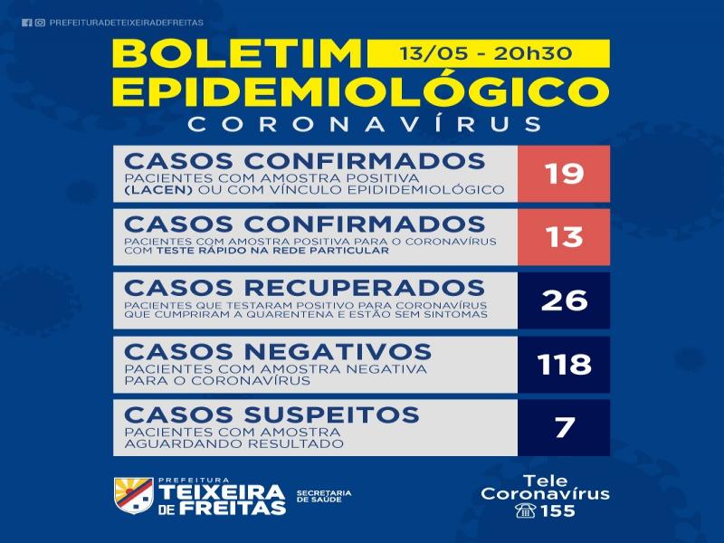 A Secretaria Municipal de Saúde informa que Teixeira de Freitas registra, em 13/05/2020, 32 casos positivos para COVID 19. Em comparação com os números oficiais do município, apresentados ontem, temos dois novos casos positivos. Os testes foram feitos fora de Teixeira de Freitas, mas são contabilizados no município que é o endereço de moradia do paciente. Um dos pacientes que estava testado positivamente pelo método Testagem Rápida (TR) em laboratório privado, teve o resultado validado pela LACEN e passou a integrar este quadrante, com isso, foi subtraído dos casos positivos via TR.