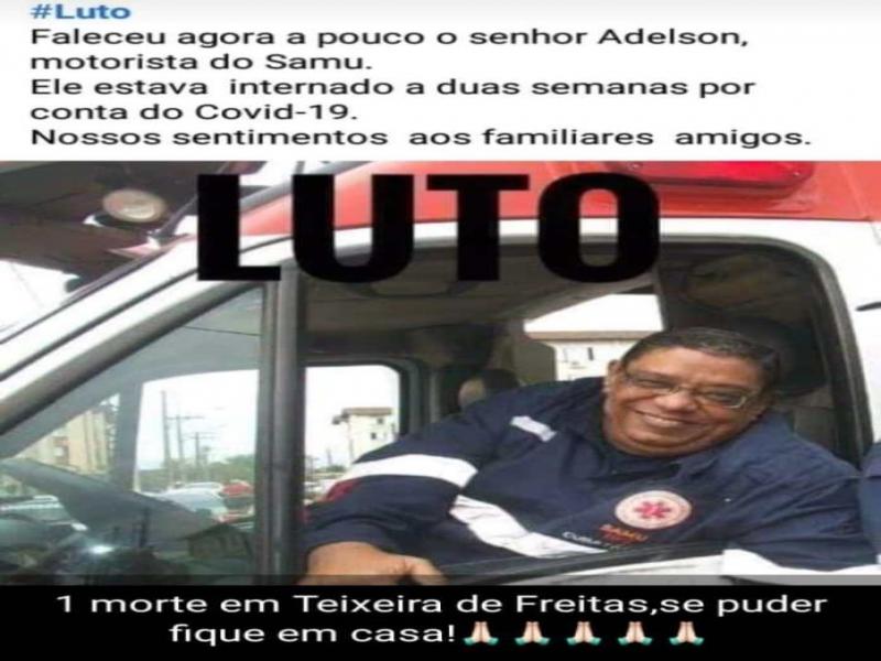 Na imagem, a mensagem de luto pelo falecimento de um motorista do Serviço de Atendimento Móvel de Urgência (Samu), que supostamente teria sido a primeira morte por covid-19 em Teixeira de Freitas. É Fake!