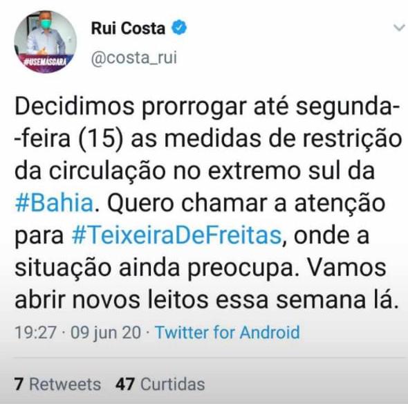 Em reunião com 19 prefeitos da região Extremo Sul da Bahia na tarde de terça-feira, 09 de junho, o governador Rui Costa decidiu por prorrogar às medidas de locomoção adotadas na região desde o último dia 03 de junho, como medida pra conter o avanço do coronavírus no Extremo Sul.