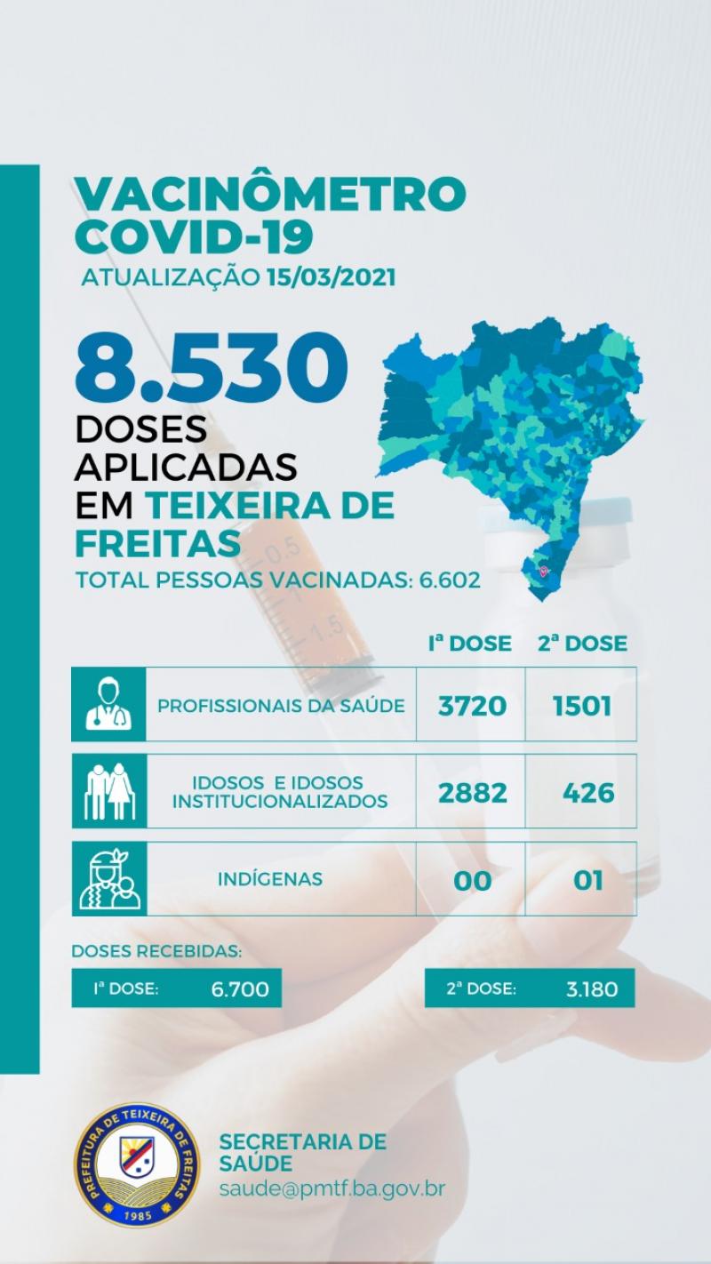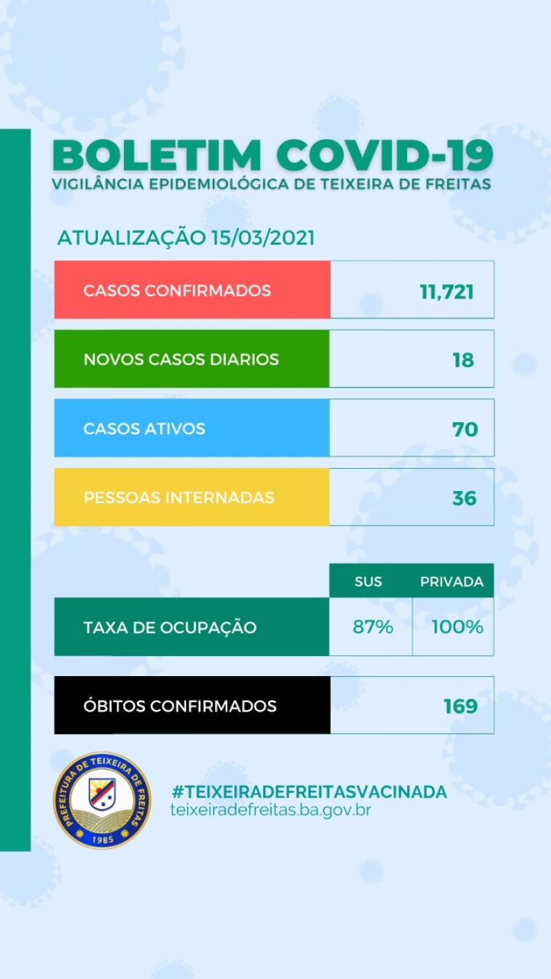 Na segunda-feira, 15 de março, a Secretaria de Saúde de Teixeira de Freitas informou que houve registro de 18 novos casos positivados. Até o momento são 11.721 casos confirmados. Destes, 87 são considerados ativos. Até o momento são 169 mortes. A taxa de letalidade em Teixeira de Freitas é de 1,54%, em relação aos casos confirmados.