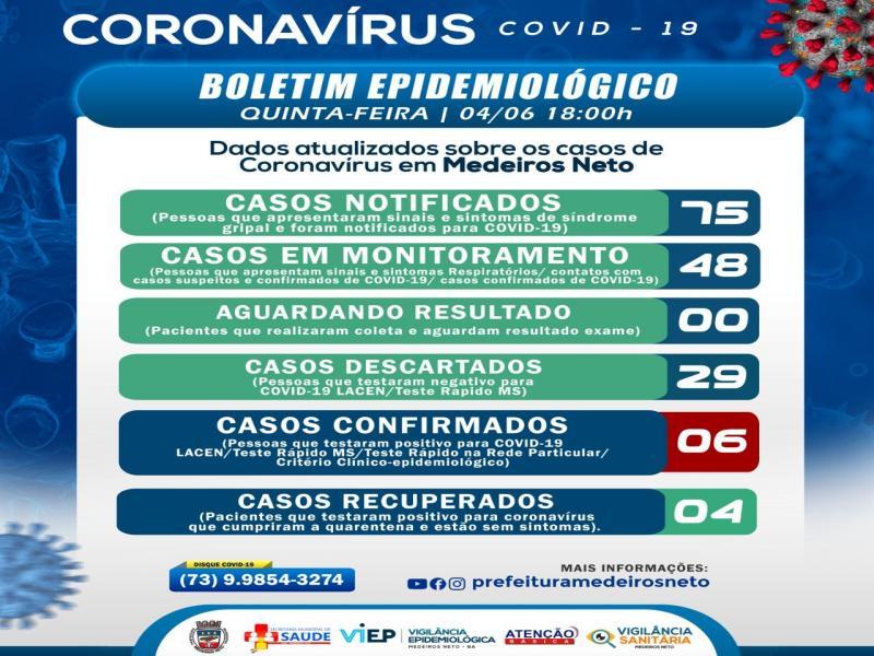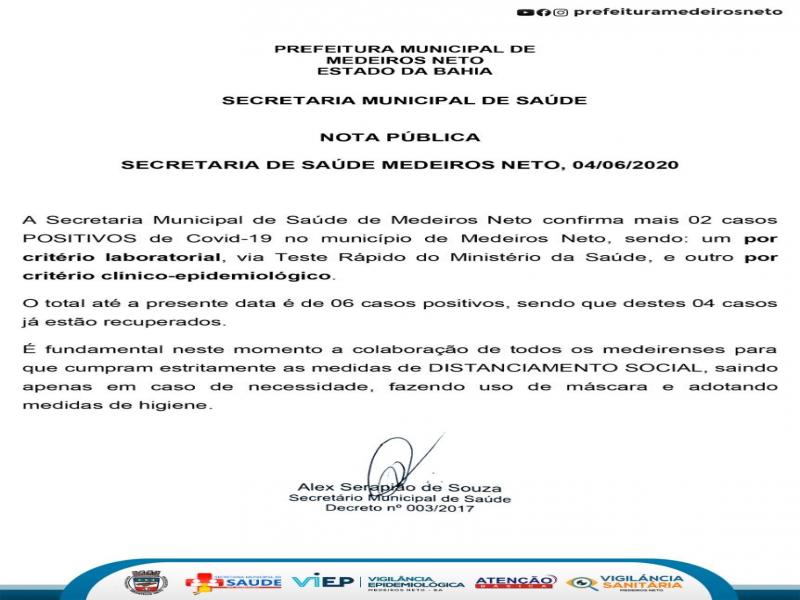 Medeiros Neto teve a confirmação de mais dois casos de covid-19. Segundo nota da Secretaria Municipal de Saúde, cada um por critério diferente: teste rápido e clínico-epidemiológico