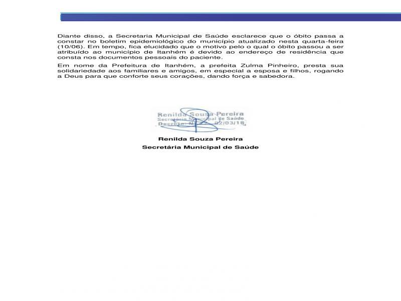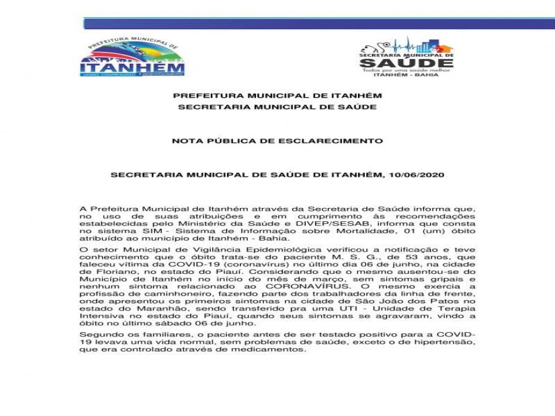 A Prefeitura Municipal de Itanhém, através da Secretaria de Saúde emitiu uma nota pública de esclarecimento sobre o primeiro óbito que foi constado no boletim epidemiológico do município publicado nesta quarta-feira, 10 de junho.