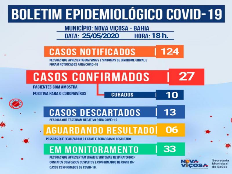 A prefeitura de Nova Viçosa através da secretaria de saúde divulgou nesta segunda feira, 25 de maio, mais um Boletim Epidemiológico com mais 03 casos do Covid 19, somado assim, 27casos da doença no município.