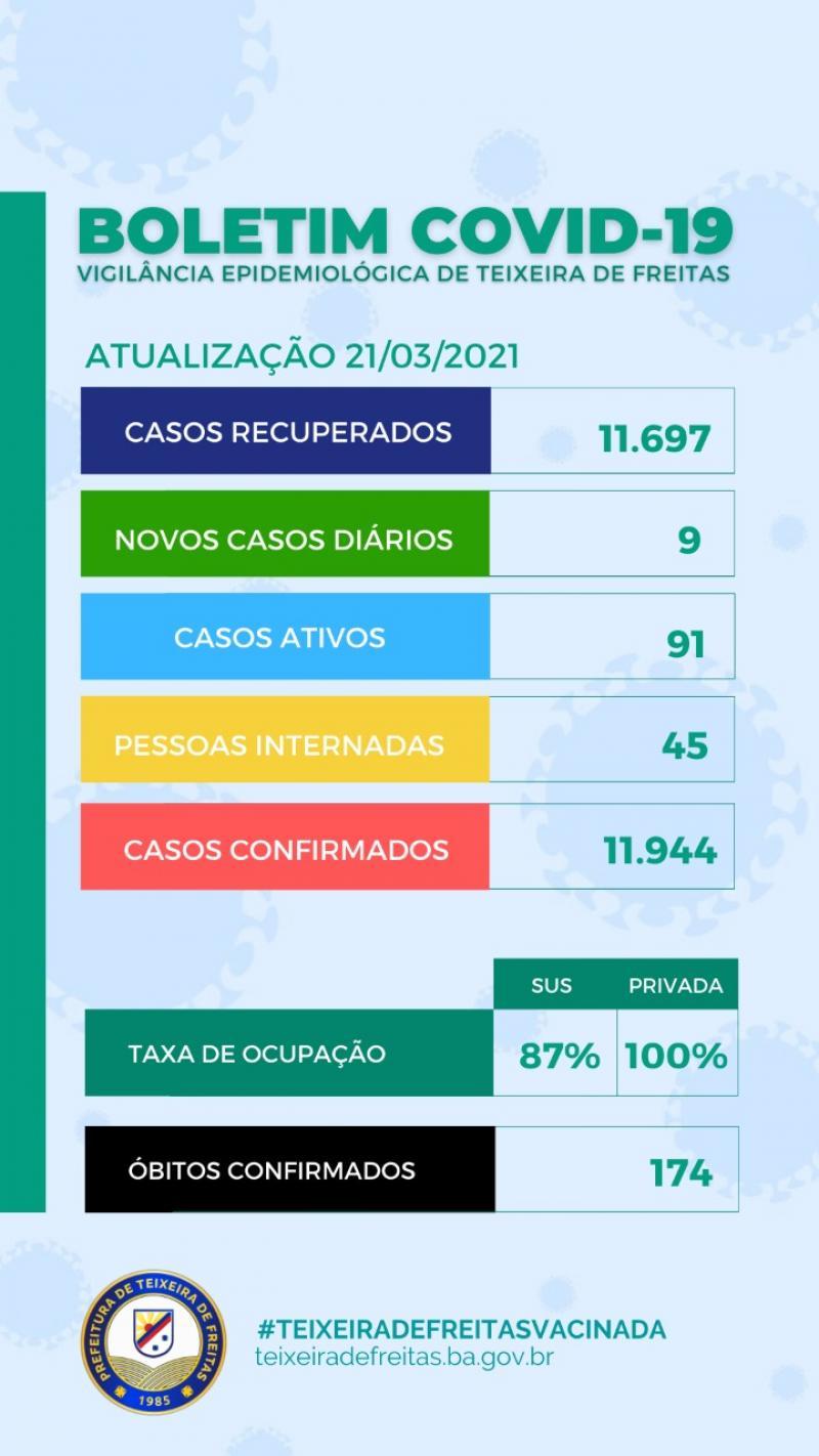No domingo, 21 de março, a Secretaria de Saúde de Teixeira de Freitas informa que houve registro de 9 novos casos positivados. Até o momento são 11.944 casos confirmados. Destes, 91 são considerados ativos. Até o momento são 174 mortes. A taxa de letalidade em Teixeira de Freitas é de 1,46%, em relação aos casos confirmados. Nossa taxa de recuperação é de 97,78%, são 11.679 recuperados.