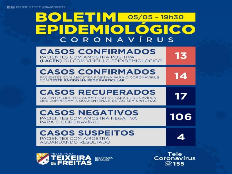 A Secretaria Municipal de Saúde informa que Teixeira de Freitas registra, em 05/05/2020, 27 casos positivos para COVID 19. Em comparação com os números oficial do município apresentados ontem, temos mais três pacientes recuperados, dois novos descartados e mais quatro em análise. Nesta data, a Bahia registra 4.040 casos confirmados e 146 óbitos.