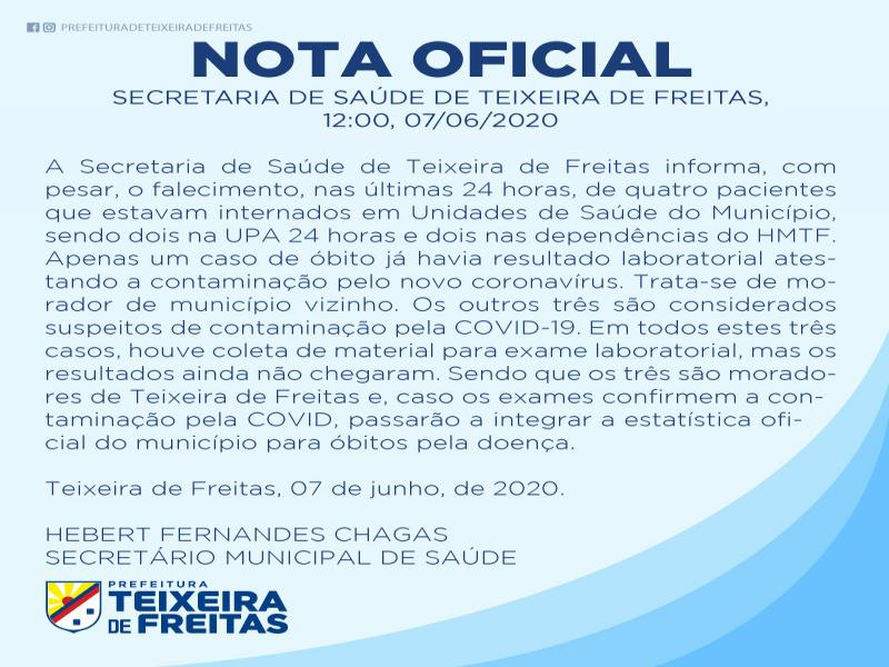 Trata-se de morador de município vizinho. Os outros três são considerados suspeitos de contaminação pela COVID-19. Em todos estes três casos, houve coleta de material para exame laboratorial, mas os resultados ainda não chegaram. Sendo que os três são moradores de Teixeira de Freitas e, caso os exames confirmem a contaminação pela COVID, passarão a integrar a estatística oficial do município para óbitos pela doença.