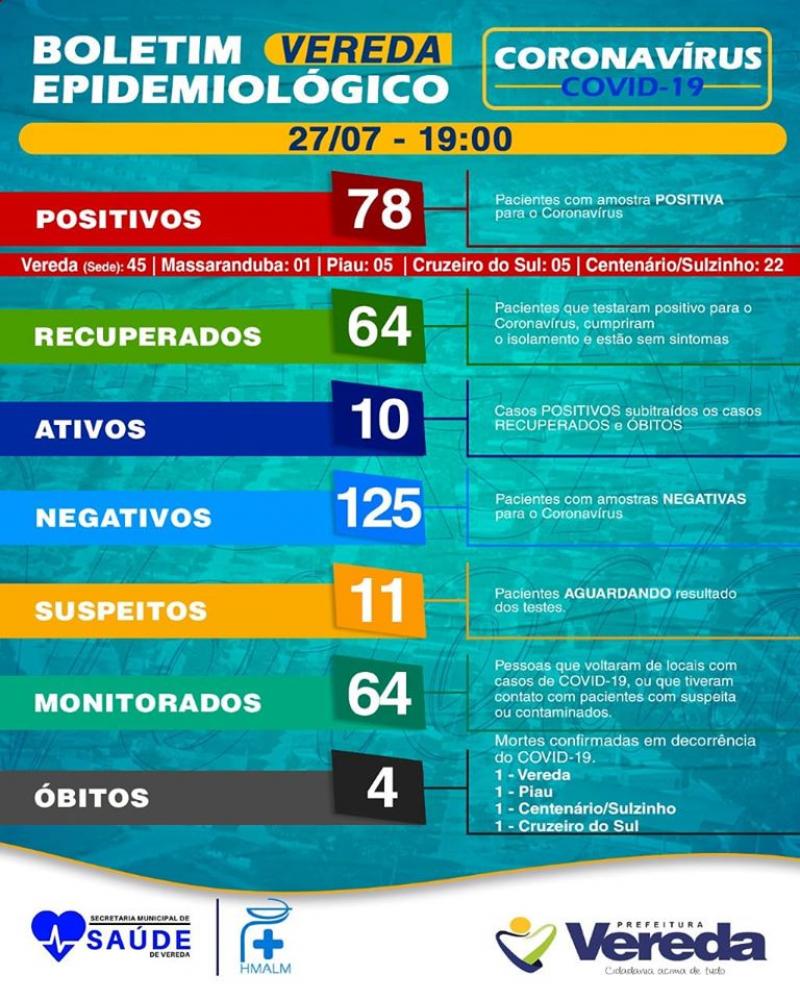 A Secretaria Municipal de Saúde de Vereda emitiu, às 19h da noite desta segunda-feira, 27 de julho, novo boletim epidemiológico com os casos positivos atualizados do novo coronavírus (covid-19); o número agora é de 78 pessoas infectadas.