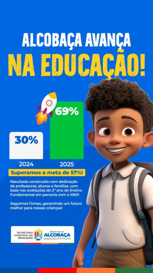 O município de Alcobaça tem se destacado no cenário educacional ao apresentar um crescimento significativo no Indicador Criança Alfabetizada. Os dados mostram que a cidade saiu de 30% em 2024 para 69% em 2025, superando a meta estabelecida de 57%.