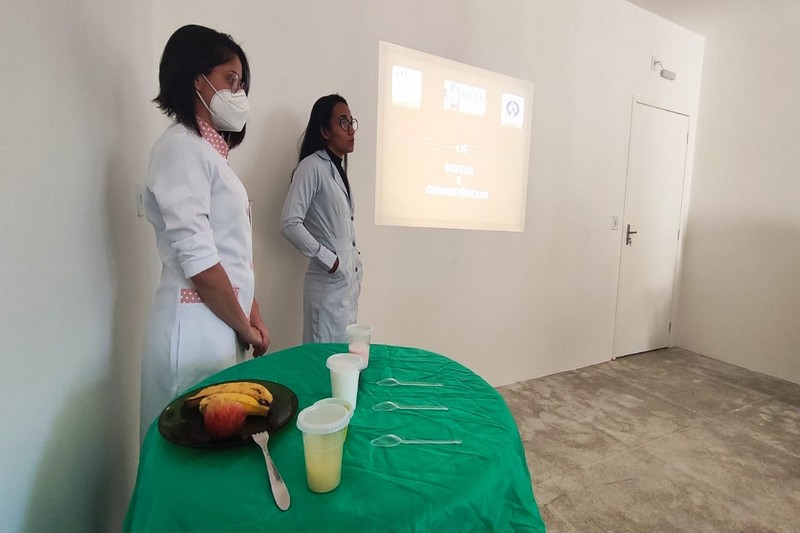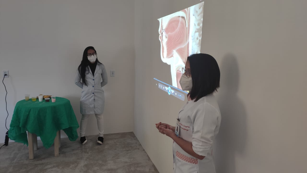 O treinamento, em forma de bate-papo e troca de experiências, foi ministrado pelas profissionais da Unidade, Dra. Maryane Falqueto – nutricionista, e Dra. Carline Duarte – fonoaudióloga, que apresentaram diversas consistências diferentes de alimentos e demonstraram como o organismo do paciente em recuperação age de forma diferente com cada uma delas. “Nosso objetivo é construir juntos, fonoaudiologia e nutrição, um protocolo padronizado porque a fonoaudiologia hospitalar é o tratamento das desordens relacionadas a alimentação e nossa terapia depende diretamente da adaptação dessas consistências de alimento. Para que a consistência contribua com a reabilitação do paciente”, explicou a Dra. Carline.