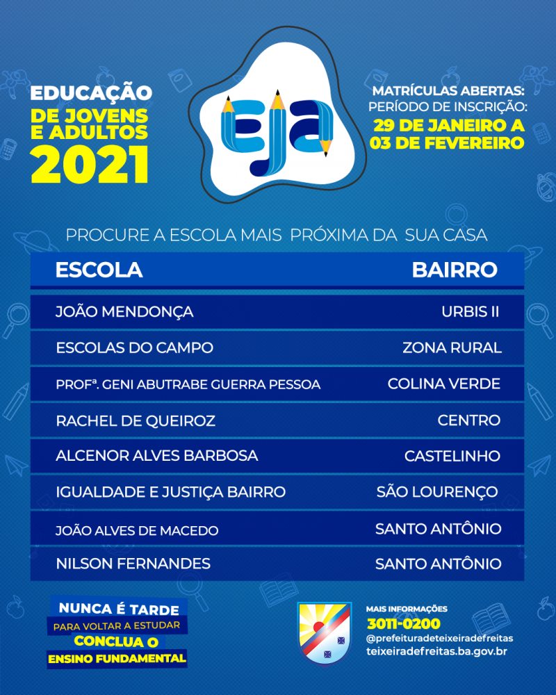 O período de matrículas da Educação de Jovens e Adultos (EJA) da rede municipal de Teixeira de Freitas será aberto no dia 29 de janeiro. As vagas disponíveis devem atender da alfabetização até a 8ª série.