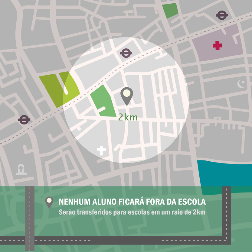 Aos alunos que forem realocados para escolas com mais de 2 quilômetros de distância de sua residência será disponibilizado transporte escolar.