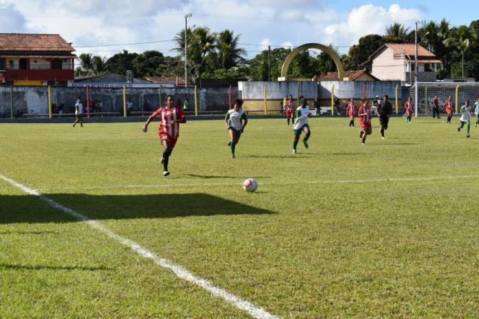As meninas do futebol feminino de Caravelas e Ponta de Areia se enfrentaram na partida preliminar, antes do jogo de abertura.